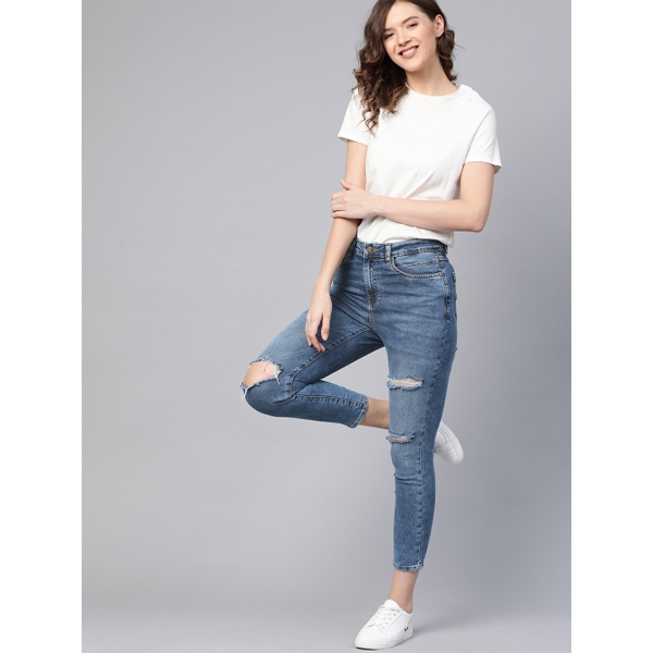 Women Blue Skinny High-Rise Distressed Light Fade Crop Stretchable Jeans