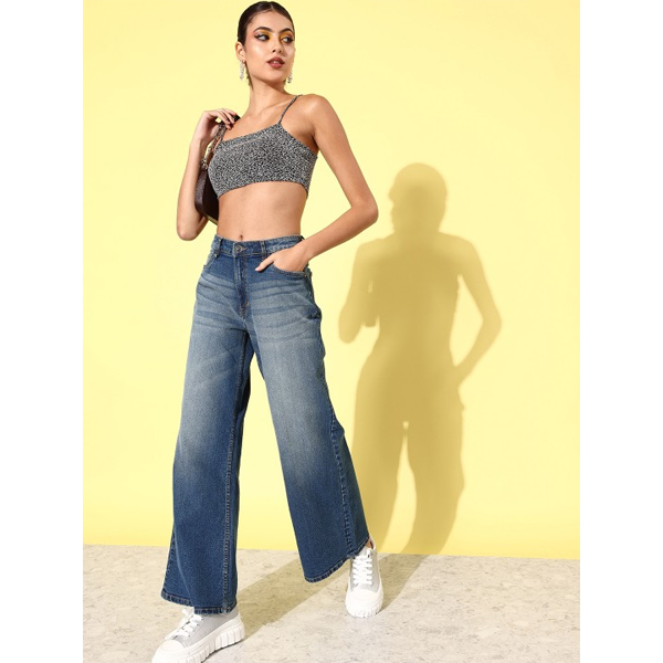 Women Medium Blue Wide Leg Heavy Fade Mid-Rise Stretchable Jeans
